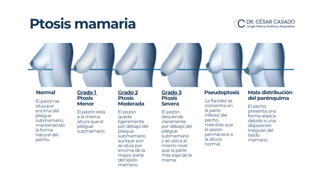 No todos los casos de caída del pecho son iguales. Los cirujanos plásticos suelen clasificar la ptosis mamaria en grados, lo que ayuda a determinar el tratamiento más adecuado: